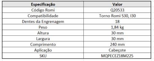 Peça compatível com tornos Romi modelos S30 e I30.
