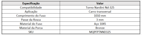 Reposição de alta precisão que melhora o desempenho do carro transversal. Fuso em aço 1045 para alta resistência, e porca em bronze que reduz o atrito, garantindo movimentos suaves, maior durabilidade e usinagem mais eficiente.