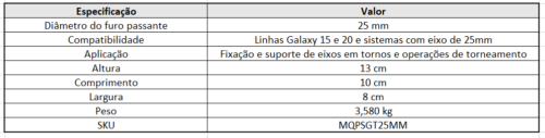 Suporte Galaxy 15/20 para torneamento com diâmetro de 25mm, desenvolvido para garantir a passagem segura de eixos, proporcionando fixação firme, alinhamento preciso e estabilidade durante operações de usinagem. Fabricado com materiais de alta resistência e durabilidade, apresenta ótimo acabamento, instalação prática e é ideal para aplicações industriais e mecânicas que exigem robustez, confiabilidade e desempenho contínuo.